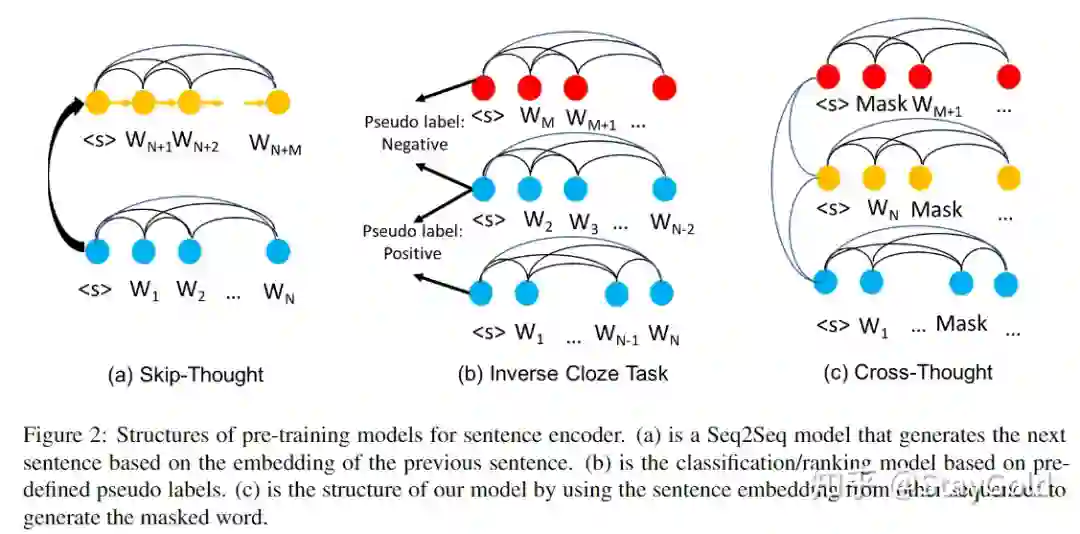 Inverse Cloze Task要求给定句子,预测其上下文的句子(类似NSP任务),如上图(b);如之前工作证明的那样,该预训练任务较弱,往往难以学到非常细粒度的、带有充分语义信息的句子表示。