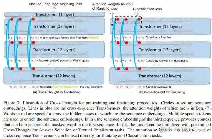 本文提出了Cross-Thought,如上图(c)所示。它将输入文本切分成许多短句,使得恢复某个短句中被mask掉token的信息较难出现在同一个短句中,而不得不依赖于其上下文其它短句的信息: