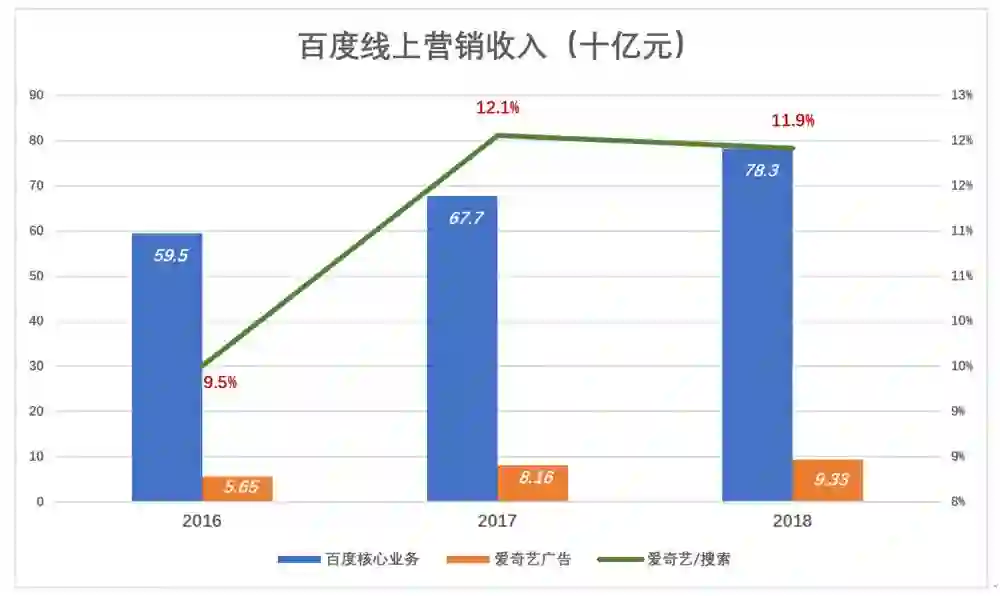 2018年,百度核心业务(Baidu Core)即大搜营收783亿、爱奇艺广告收入99.3亿。2017年、2018年爱奇艺广告收入与大搜收入的比例分别为12.1%和11.9%,几乎没有变化。