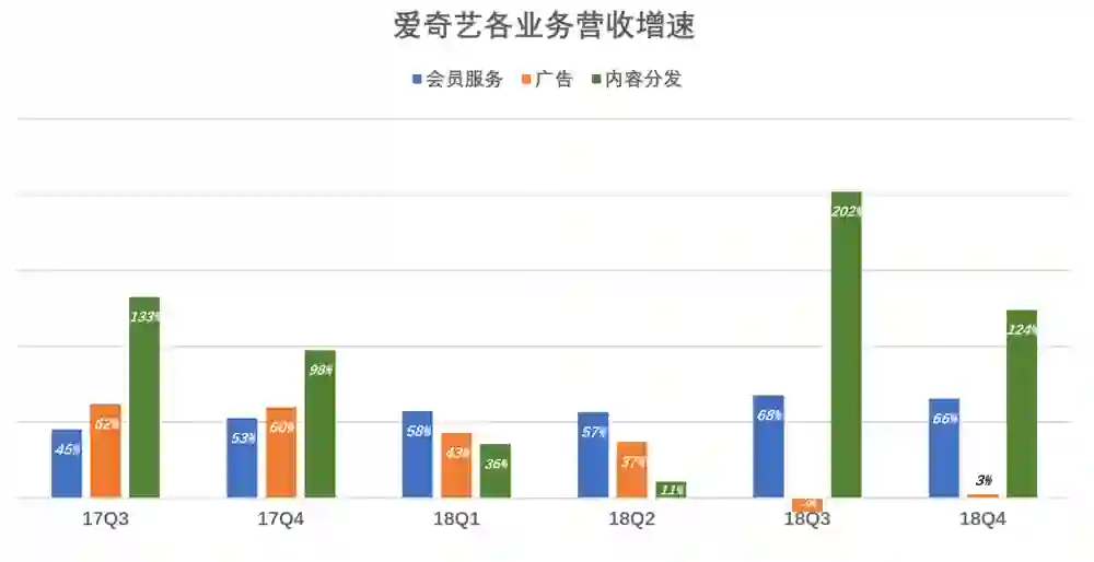 从2018年Q2开始,爱奇艺广告收入突然“失速”,从Q1同比增37%降到Q2同比减少9%。与此同时,会员服务收入同比增长68%,版权内容分销增长202%。