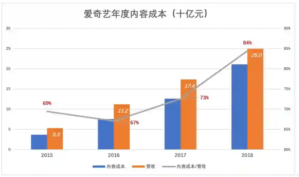 2015年~2018年,爱奇艺内容成本分别为36.9亿、75.4亿、126.2亿和211亿。三年间,营收增长370%、内容成本增长471%。