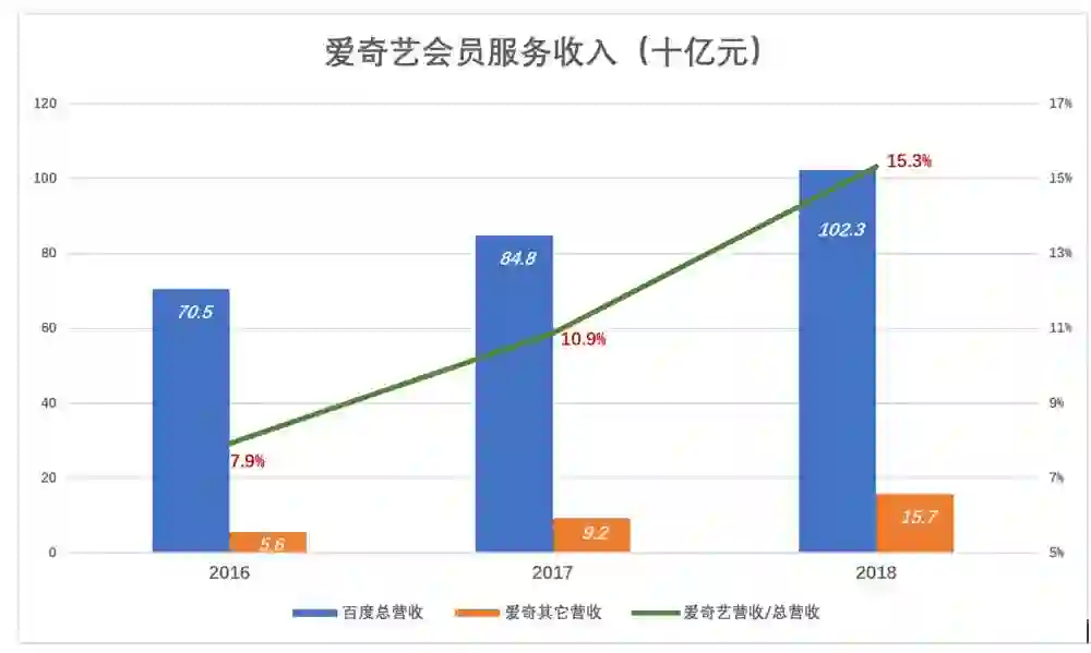 2018年,爱奇艺会员服务收入为106亿,加上内容分发、游戏运营等收入合计达157亿,占百度总营收的15.3%。
