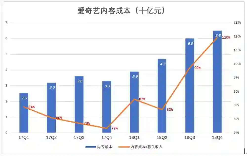 以内容成本为分子,把广告、会员服务、内容分发等收入加起来做分母,得到的数值大有“一飞冲天”之势。2018年Q2,内容成本是相关收入的83%,到了Q4这个数值变成110%。