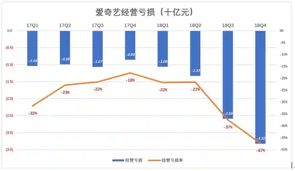 内容成本节节攀升,市场费用、研发费用居高不下,爱奇艺经营亏损“涨势”惊人:2018年Q1亏10.6亿,Q4亏33.2亿,亏损率达47%。2018年,爱奇艺经营亏损83.1亿,相当于营收的33%。#收入三块亏损四块钱#