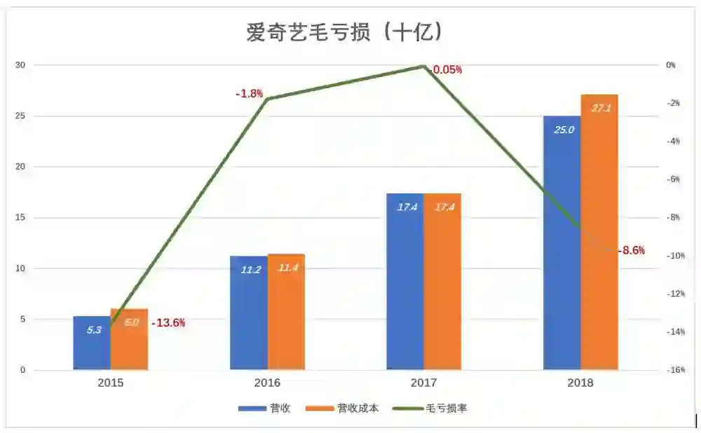 2017年爱奇艺毛亏损率曾无限接近于零,2018年毛亏损率又扩大到8.6%。2018年毛亏损21.4亿,而2015~2017三年才亏了9.3亿。