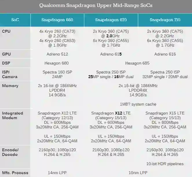 而此次的全新骁龙670似乎直接来自于骁龙710,两款产品在规格上非常接近,乍一看很容易忽略它们的区别。