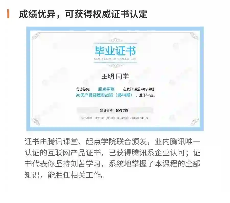 行业认证证书:成绩优异的学员,还将获得业内腾讯唯一认证的互联网产品证书,这意味着获得腾讯系企业认可,含金量满满!