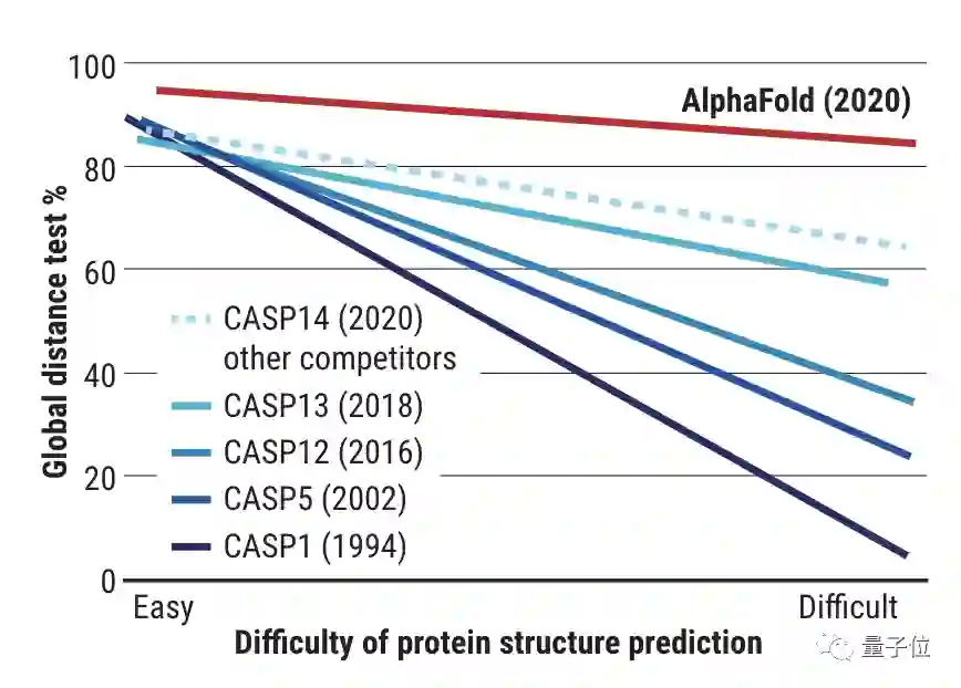 从1994年起,随着技术的进步,蛋白质的预测准确性在不断增加,而在今年,迎来了重大突破,预测准确性得分达到了92.4/100。