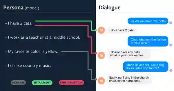 左边的是机器人的回复,第一条回复表示有两只猫,第二条回复却表示自己没有宠物,这样自相矛盾的信息会让会话体验变差。Facebook在论文《Dialogue Natural Language Inference》提出了一个新的模型,大大提升了会话机器人的回复一致性,自相矛盾的回复减少了3倍。