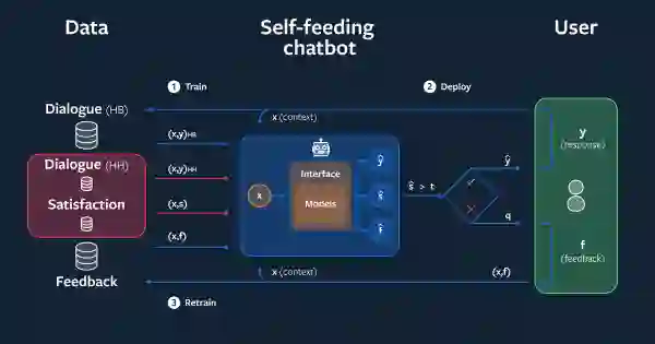 self-feeding会话机器人回复人类用户后,会评估每一次人类用户的满意程度。当用户不满意时,self-feeding会话机器人会收集用户反馈,并构建一个模型用于预测用户的满意度。self-feeding会话机器人会根据满意度,给出一个还不错的回复。使用了该方法后,回复的准确率提升了31%.