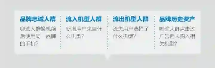 智能手机厂商需要从其他品牌中抢夺用户,第一步是锁定抢夺对象。也就是说,需要了解什么品牌拥有本品牌目标受众,以及这些目标受众对于本品牌的倾向性。比如说,用户选择本品牌之前使用过什么品牌和机型,流失的用户之后选择了什么品牌和机型。针对这些特定品牌和机型的用户进行投放,不仅拓展了营销对象的范围,更是在用户争夺战中的成败关键之一。