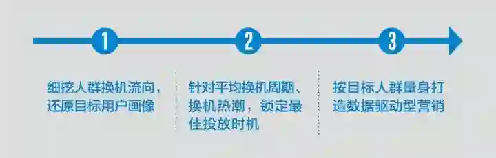以腾讯推出的智能手机行业DMP营销解决方案为例,通过多方数据来源进行大数据分析,追溯消费者的历史手机选择,为厂商精准洞察消费者的换机倾向,以“换机营销三部曲”,助力厂商在存量争夺战中出奇制胜。