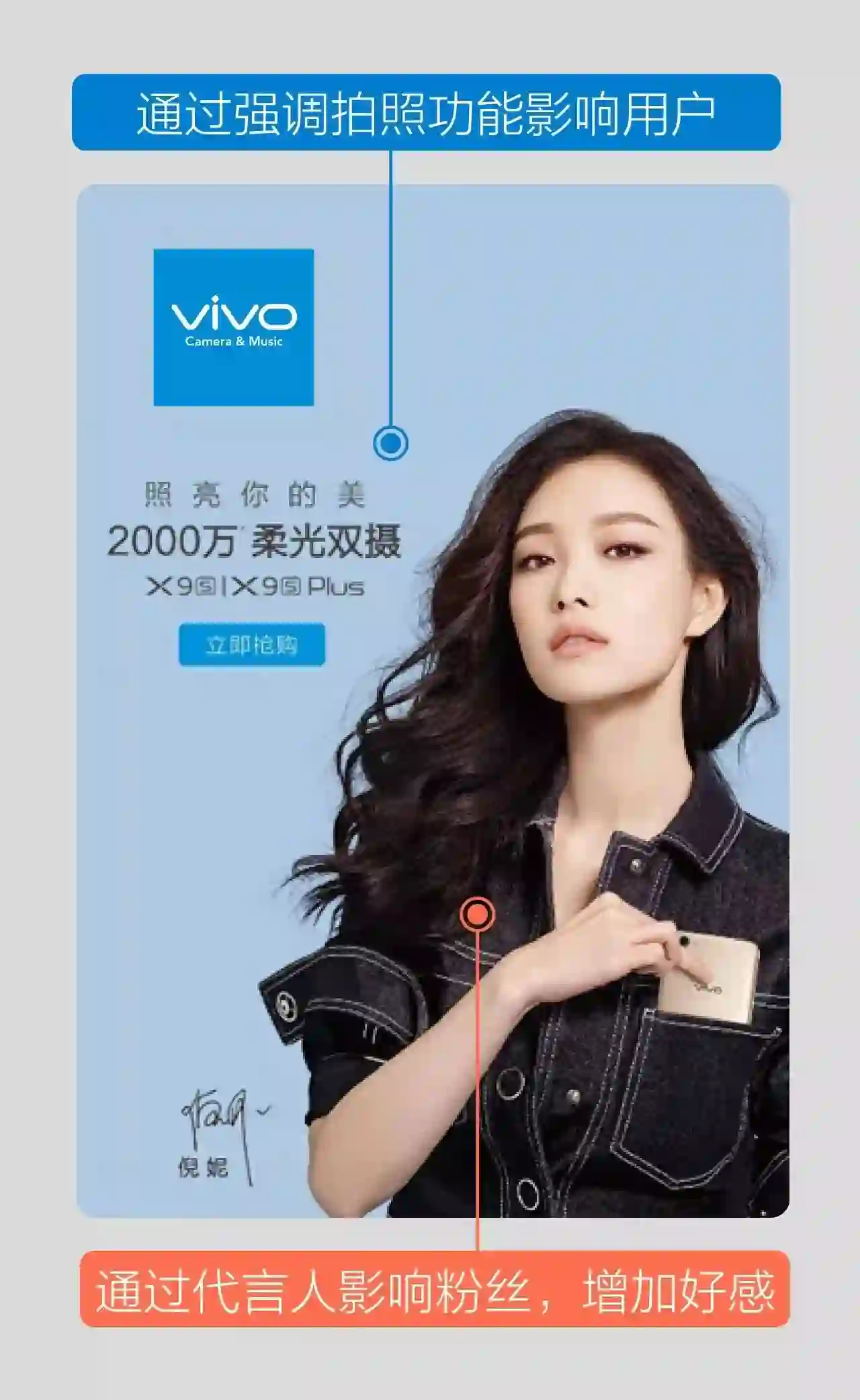 同样以vivo为例,腾讯智能手机行业DMP营销解决方案一方面根据目标受众喜欢拍照、关注明星的特性,在广告素材上突出了机型的拍摄功能,并通过代言人吸引粉丝,增加粉丝对品牌的好感。