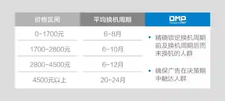 那么,要如何得知用户现在是否处于换机决策期呢?其实,不同价格区间的手机用户有着不同的更换频率。比如说,价格介乎在2800元至4500元的手机用户,平均每6至12个月会更换手机。也就是说,在用户使用手机6至12个月的时候,成功吸引这个区间的用户换机的几率更高。