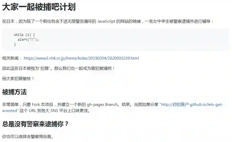 为了抗议日本警察采取的行动和将此行为定为犯罪的荒谬做法,东京开发者 Kimikazu Kato 在 GitHub 上创建了一个名为 Let's Get Arrested(来逮捕我们)的仓库(https://github.com/hamukazu/lets-get-arrested)。fork 这个项目,然后创建一个名为 gh-pages 的分支,就能创建一个托管在 GitHub 上的简单网站,该网站只含有无限循环警告,犯罪行为简直触手可及。