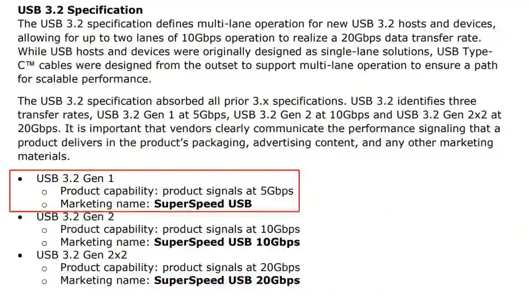 所谓 USB3.1,其实就是 USB 数据传输的速率等级。手机业内基本都是 USB3.1 gen1,可能也有读者会听说过 USB3.2 gen1,这些都是 USB3.0 的官方改名,源于 USB IF 自己的骚操作。