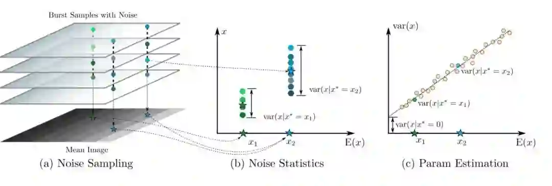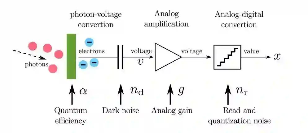 在理想情况下应该如公式(1)所示,预期打到像素区域的光子数量u*,经由转换效率alpha及模拟增益g两重作用之后,得到一个理想的像素强度值x*。然而,由于光子存在着波粒二象性,分布服从公式3,并且转换过程也会存在着噪声的影响,实际的CMOS成像过程为公式2,模拟增益g之前会存在暗电流,分布服从公式4的高斯分布,模拟增益之后的读出噪声分布服从公式5,这里将量化噪声也包含在读出噪声之中了。