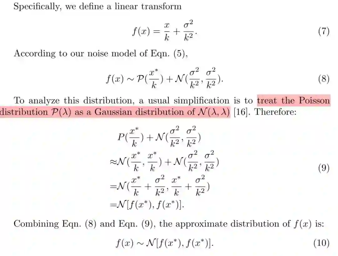 将实际得到的像素强度x,依据标注得到的k与sigma进行上图(7)的变换之后,可以得到一个只依赖于x*分布的数据。x对应于实际得到的、带有噪声的noisy的数据,x*对应于理想的、没有噪声的clean的数据,这样可以通过模型来对x进行降噪之后,再进行k-sigma逆变换得到干净的数据。