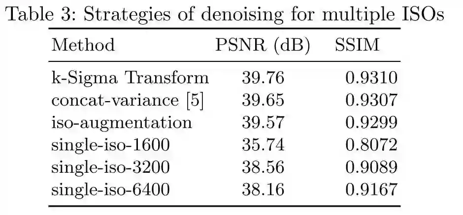 如下图所示,可以看到使用单个的ISO的数据来进行训练时,泛化效果明显差于使用不同的ISO来进行训练的结果,也差于显示使用noise map的结果,使用k-sigma变换之后的盲降噪效果最好。