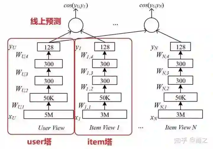 百度的双塔模型分别使用复杂的网络对用户相关的特征和广告相关的特征进行 embedding,分别形成两个独立的塔,在最后的交叉层之前用户特征和广告特征之间没有任何交互。这种方案就是训练时引入更多的特征完成复杂网络离线训练,然后将得到的 user embedding 和 item embedding 存入 Redis 这一类内存数据库中。线上预测时使用 LR、浅层 NN 等轻量级模型或者更方便的相似距离计算方式。这也是业界很多大厂采用的推荐系统的构造方式。