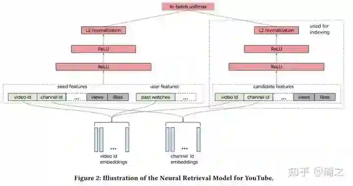 2019 年谷歌推出自己的双塔模型,文章的核心思想是:在大规模的推荐系统中,利用双塔模型对 user-item 对的交互关系进行建模,从而学习【用户,上下文】向量和【item】向量的关联。针对大规模流数据,提出 in-batch softmax 损失函数与流数据频率估计方法更好的适应 item 的多种数据分布。利用双塔模型构建 YouTube 视频推荐系统,对于用户侧的塔根据用户观看视频特征构建 user embedding,对于视频侧的塔根据视频特征构建 video emebdding。两个塔分别是相互独立的网络。