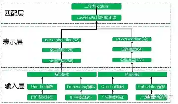 DSSM 模型总的来说可以分成三层结构,分别是输入层、表示层和匹配层。以广告推荐中的 DSSM 双塔模型结构为例,如下图所示: