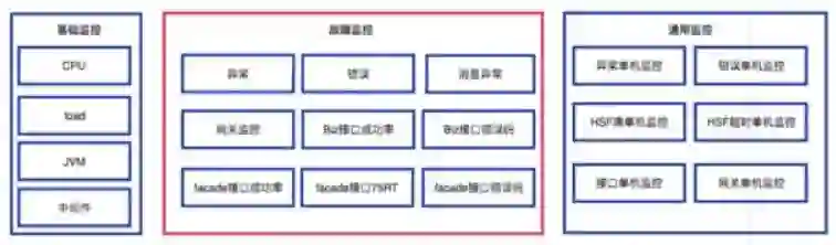 所谓故障监控,就是这些监控发生报警意味着有故障产生了。我们认为一切外在因素如果对应用产生影响,那么必然反应在接口的 RT 和成功率上,要么引起接口 RT 升高,要么导致接口失败数增加,成功率下跌,如果没有这种影响,那么这个外在影响可以被忽略掉。因此我们把接口监控作为故障监控的一大块来重点配置,如果每个应用都配置了核心接口的故障监控,在排查问题时,就很容易定位是否由于上游应用的某个接口导致了我的应用出了问题。