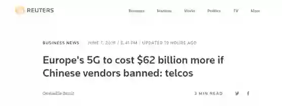 路透社称,上述550亿欧元的估值反映了全面禁止中国通信设备供应商华为和中兴通讯(ZTE)对欧洲推出5G网络所带来的额外成本,而这两家中国公司在欧盟的市场份额合计超过40%。