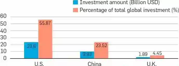 2020年美国、中国和英国对人工智能初创企业的投资金额比较
