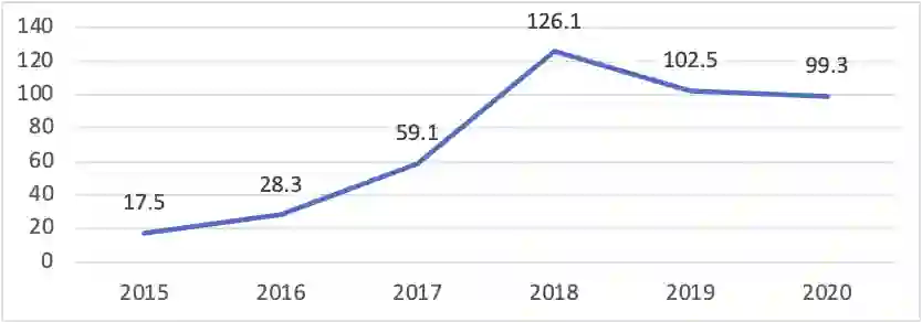 中国在2017年和2018年对初创企业的投资有了非常大的增长,并在2018年达到了最高的126亿美元。然而,在2019年和2020年期间则有所下降。