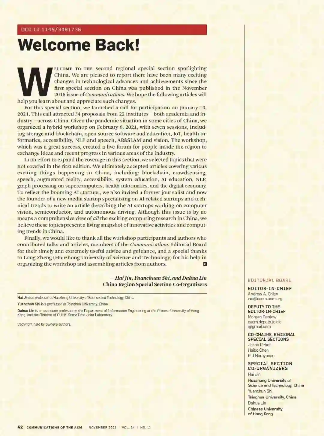 2018年11月CACM首次推出中国专辑,三年后再次推出新一期的中国专辑。涵盖内容包括区块链、群智感知、语音处理、增强现实、系统及AI教育、自然语言处理、超算应用、健康信息、数字经济等。