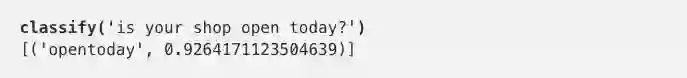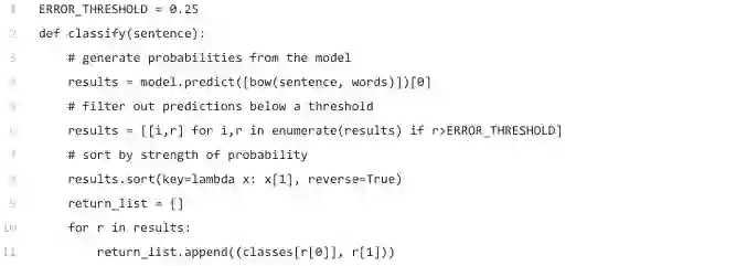 每个传递给response方法的句子都被分类。分类器使用model.predict()并且非常快。模型返回的概率向量与我们的意图按顺序一一对应,生成潜在响应列表。