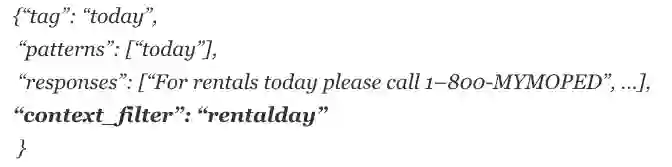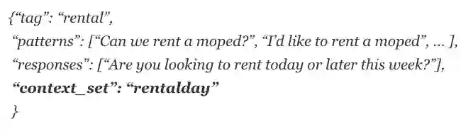 聊天机器人框架框架需要一个能定义会话意图的架构。有一个简洁的实现方式,是使用JSON文件(https://github.com/ugik/notebooks/blob/master/intents.json)。