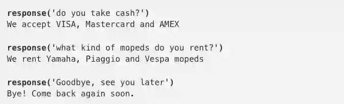 我们将创建一个聊天机器人框架,为一个小岛上的轻便摩托车租赁店建立一个对话模型。这家小店的聊天机器人需要处理营业时间,预订选项等简单问答。我们也希望它能处理客户根据上下文提出的问题,例如关于同一天租金的查询。体验能做好的话,可以让客户的假期留下美好回忆!