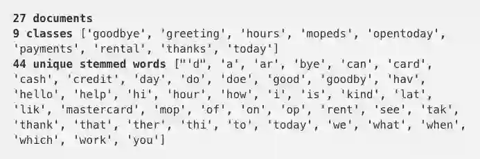 我们创建了文件(句子)列表,每个句子是一个由词干组成的列表,每个文件关联一个意图(一个类对象)。