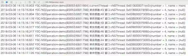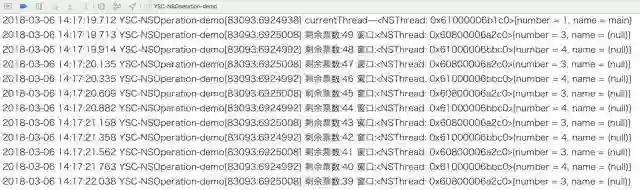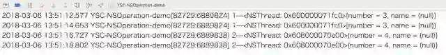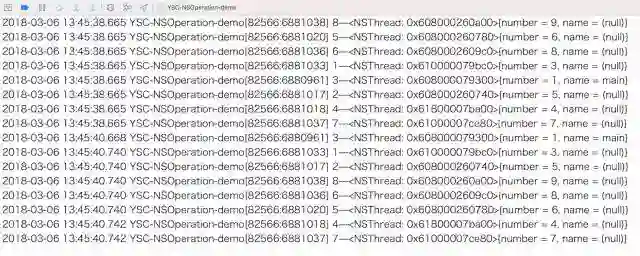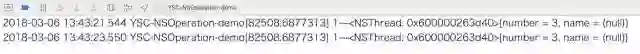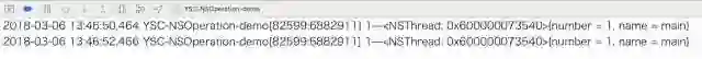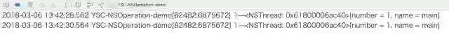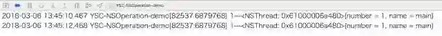 注意:和上边 NSInvocationOperation 使用一样。因为代码是在主线程中调用的,所以打印结果为主线程。如果在其他线程中执行操作,则打印结果为其他线程。