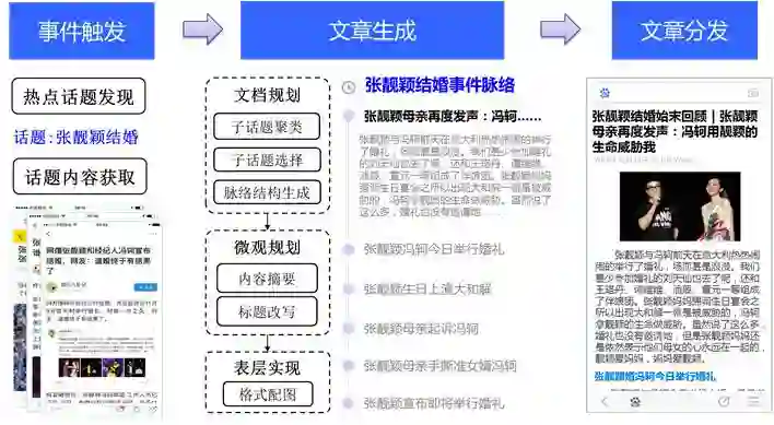 另一类是在已有稿件的基础上通过内容分析聚合生成的新的文章。大部分资讯聚合类文章,如话题盘点、事件脉络、热门要闻回顾等都属于此类。因为是基于已有稿件内容创作新的稿件,因此可以看作是二次创作。当然,我们也可以在一篇文章的生成中结合上述两种技术,进行混合创作。