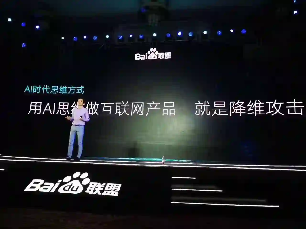 【新智元导读】今天在百度联盟大会上,李彦宏发表演讲,阐释AI时代的思维方式:①手机还会长期存在, 但移动的机会不多了 ②From think Mobile to think AI ③软硬结合,重新定义"以人为本" ④数据秒杀算法, 算法推动社会进步 ⑤用AI思维做互联网产品就是降维攻击
