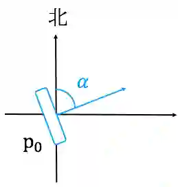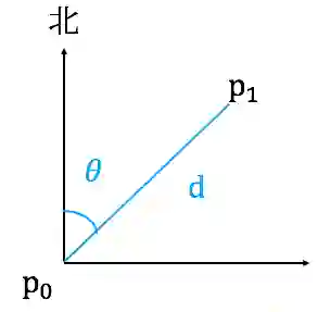 首先考虑空间上的两个点P0、 P1,以P0为原点,横轴代表纬度,纵轴代表经度,这样我们可以求得两点位于正北的偏角θ;