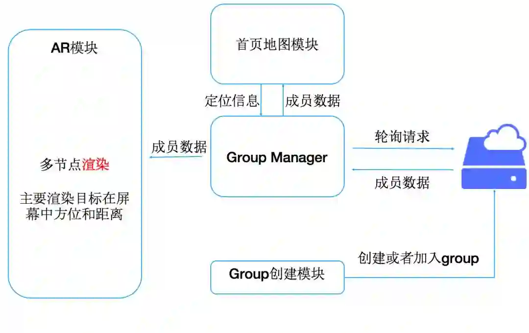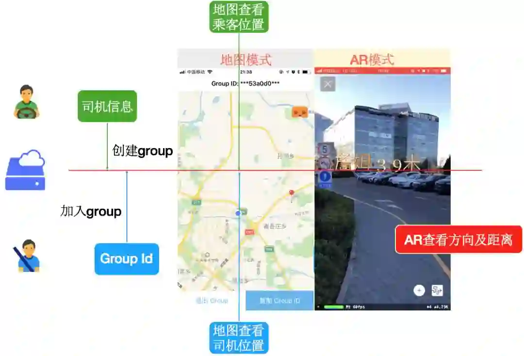 很快我们就把上面的想法落地实现了,开发了一个叫做WhereAreYou的简单App应用,相当于AR版本的微信共享位置,只要打开摄像头就可以看到小伙伴们的方位和远近。当然了,应用于打车场景下,就是让用户知道目标车辆从何驶来、距离多远。程序大概结构如图一所示: