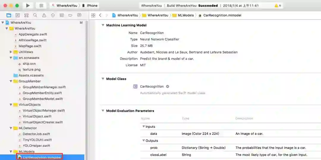 上面所说的“可以让开发者很容易地在应用中集成机器学习模型”是什么意思呢?是指如果你有一个CarRecognition.mlmodel 文件,你可以把它拖入到Xcode中: