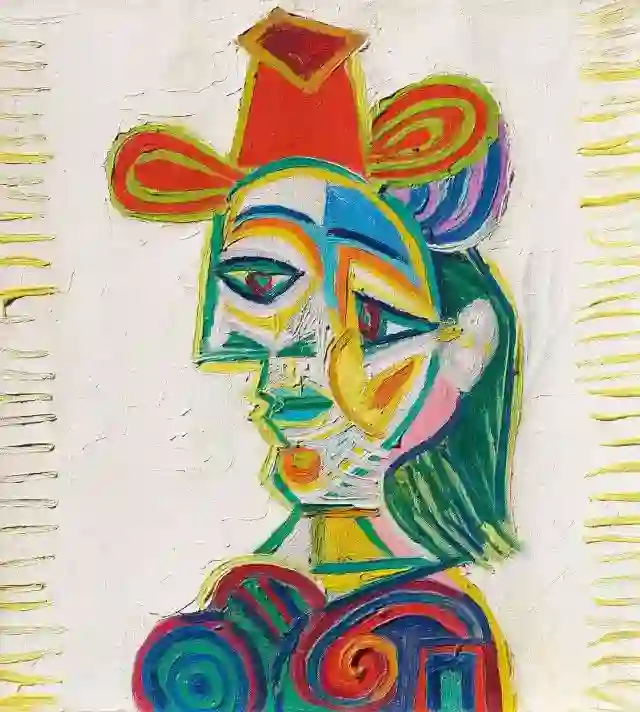 如今,毕加索这个时期的画作,大多都以永久藏品的身份收在某个博物馆里。不过不久前,两幅毕加索所作的朵拉肖像画,一起在佳士得的一场拍卖会上出现了。这两幅画,分别创作于1938和1943年。1938年的这幅《女人半身像》(Buste de femme),正是这些半身肖像中的精品之一。这幅小画中,朵拉戴着的是红色的帽子,帽里很深,几乎有种王冠的意味。