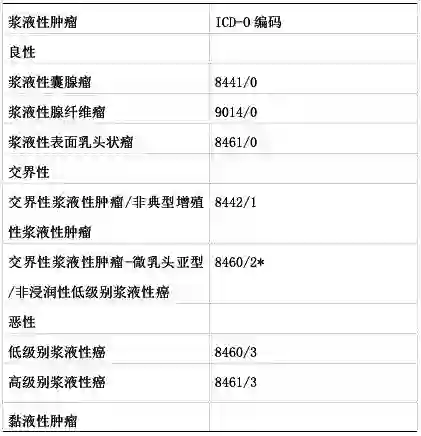 组织病理组织学检查是卵巢癌诊断的金标准。卵巢上皮性癌主要病理类型有:浆液性癌(80%),子宫内膜样癌(10%)、透明细胞癌(10%)、黏液性癌(3%),除此之外,还有其他一些少见病理类型(表1)。其中浆液性癌最常见,分为低级别(LGSC)和高级别浆液性癌(HGSC)。在基因水平,低级别浆液性癌具有高频的 KRAS 和 BRAF 突变,但罕见 TP53 突变;高级别浆液性癌以遗传学高度不稳定和几乎所有病例皆有 TP53 突变为特征。低级别浆液性癌通常是双侧发生,镜下有多种结构模式,包括单个细胞和形状不规则的小细胞巢杂乱地浸润间质,微乳头或较少见的大乳头,外围分开的透明空隙;不同的浸润模式通常并存。很多 LGSC 有并存的交界性浆液性肿瘤/非典型增殖性浆液性肿瘤成分。与 HGSC相比,坏死几乎从未检测到,沙粒体很常见,核分裂活性很低(通常<3/10HPF)。HGSC 通常由实性细胞团块组成,有裂隙样腔隙。常有乳头状、腺样和筛状区域。坏死常见。 核大,深染和多形性,常有大的奇异形核或多核。核仁通常明显,可能很大、嗜酸性。核分裂象很多,常有非典型核分裂象。沙粒体多少不一。卵巢生殖细胞肿瘤主要包卵黄囊瘤、无性细胞瘤和畸胎瘤三大类,还有一些起源于单胚层的肿瘤(表1)。各种组织学类型的卵巢上皮癌在发病机制、免疫表型、突变基因和预后方面均有所不同(表2)。