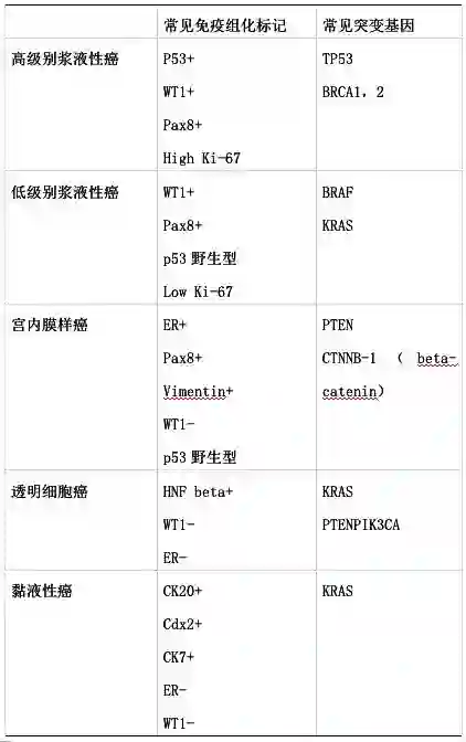 表2 卵巢上皮癌各亚型常见免疫组化标记和突变基因