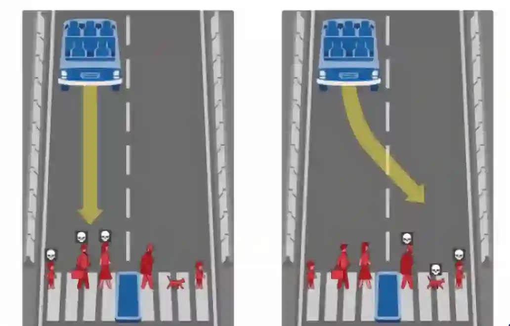 在实验中,想象一个飞驰着失控的电车轨道上有5个人,但转到另一条轨道上只有1个人,你愿意牺牲一个人去救活这五个人的性命么?任何人都难以做出抉择。将这个情境应用到无人驾驶汽车的情景上,如果汽车行驶到一条路撞小男孩,一条路撞老奶奶,而不继续行驶,车内人的生命就会受到威胁,这种情况下无人驾驶汽车又该如何抉择?