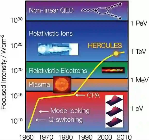 自CPA技术之后近30年的时间里,不仅激光的峰值功率及强度提高了近10个量级,而且激光装置的体积及成本也大大降低,得以广泛应用于高校和研究所。由于CPA技术在激光强度发展的历史中所起的作用,美国将基于CPA技术搭建的激光系统用于快点火激光聚变工程,以期彻底解决能源问题。国际上许多顶级实验室也相继建成了多台峰值功率超过拍瓦级别 (PW)的CPA装置:如劳伦斯利弗莫尔国家实验室(Lawrence Livermore National Laboratory,LLNL)的1.5 PW、450 fs钕玻璃激光系统,中科院物理研究所的1.16 PW、30 fs激光装置,韩国先进光子学研究所的1.5 PW钛宝石CPA激光系统,中物院激光聚变中心的5 PW级激光装置和中科院上海光机所最新获得的10 PW装置等。作为欧盟未来大科学装置的极光设施(Extreme Light Infrastructure,简称ELI),目标定为发展峰值功率高达200 PW的超强超短激光装置。