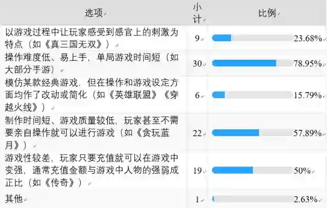 从表格中可以看出,最为广泛认可的阐述,是“操作难度低、易上手、单局时间短”。除此之外,超过半数人认为,快餐游戏是质量低、游戏性差、氪金需求高的,是粗制滥造的代名词。