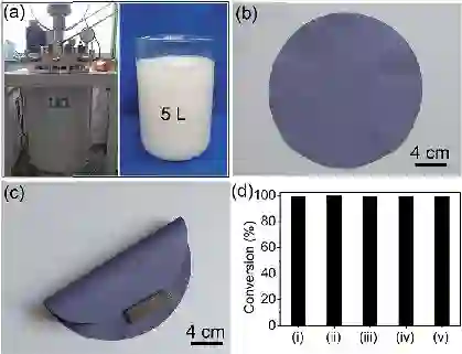 新型层状结构催化耐火纸在连续流动催化反应中表现出优异的催化性能。实验表明,在室温下,含有4-硝基苯酚和硼氢化钠的水溶液只要倾倒在新型催化耐火纸上,就像水溶液过滤一样很快流过催化耐火纸,催化反应就完成了,4-硝基苯酚就转变为4-胺基苯酚,催化反应快速并且催化效率很高(~100%)。同样,采用连续流动催化反应,新型催化耐火纸也可对多种有机染料例如罗丹明B、甲基橙等实现高效快速降解,被有机染料污染的水溶液只要倒在催化耐火纸上快速流过,就可实现污水的连续高效快速净化。此外,研究团队还实现了羟基磷灰石超长纳米线的10升级反应釜的放大制备和大尺寸新型层状结构催化耐火纸的制备,所制备的大尺寸催化耐火纸具有良好的均匀性和可重复的高催化活性。