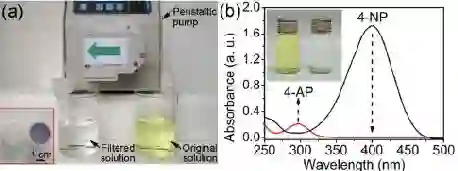 新型层状结构催化耐火纸在流动催化反应中表现出优异的催化性能,在室温下含有4-硝基苯酚和硼氢化钠的水溶液只要倾倒在新型催化耐火纸上,就像水溶液过滤一样很快流过催化耐火纸,催化反应就完成了,催化效率高达~100%