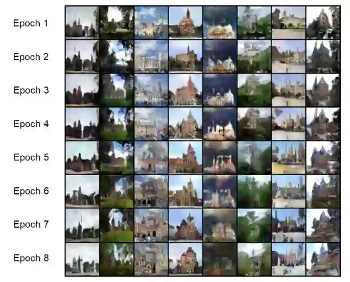LSUN church-outdoor 数据集 (epoch on the left, 还在训练中):